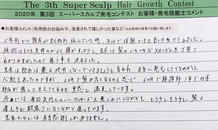 2年前から頭皮が見え始め悩んでいた時、ネットで体験コースを見つけ、受けてみました。施術はとても気持ちがよく、頭がすっきりし、先生は髪のいろいろなメカニズムを丁寧でわかりやすかったので通う事を決めました。