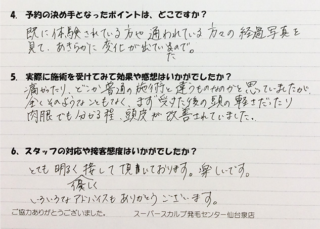 痛かったり、どこか普通の施術と違うものなのかと思っていましたが、全くそのようなこともなく、まず受けた後の頭の軽さだったり、肉眼でも分かる程、頭皮が改善されていました。