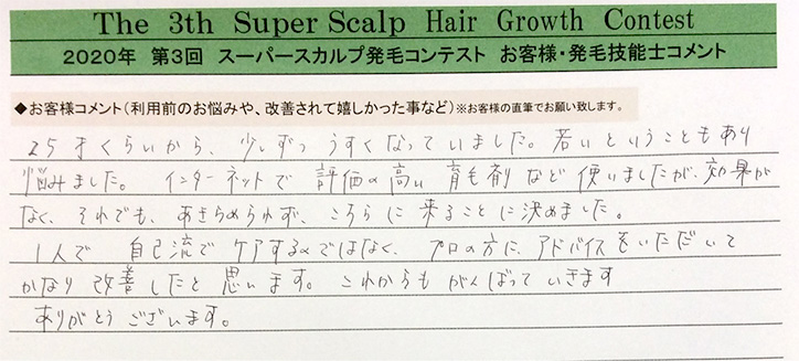 25才くらいから、少しずつうすくなっていました。若いということもあり悩みました。インターネットで評価の高い育毛剤など使いましたが、効果がなく、それでも、あきらめられず、こちらに来ることに決めました。