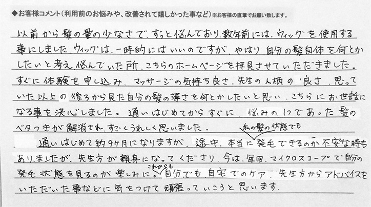 すぐに体験を申込み、マッサージの気持ち良さ、先生の人柄の良さ、思っていた以上の後ろから見た自分の髪の薄さを何とかしたいと思い、こちらにお世話になる事を決心しました。