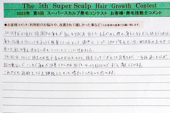 30代半ばの頃から頭頂部の薄毛が気になりはじめ、徐々に左右の生え際も薄毛になりすごく悩んでいました。薄毛治療のクリニックをネットで検索していたところ、偶然にスーパースカルプ発毛センター仙台泉店のホームページを見つけ、飲み薬を使わない発毛ということでここに決めました。