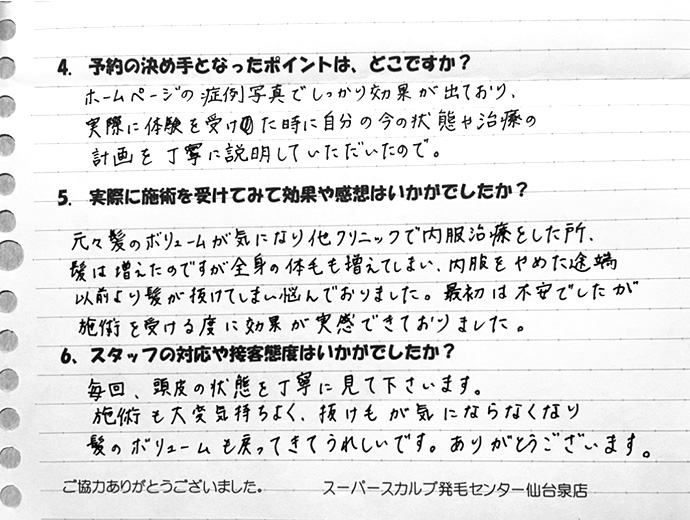 施術も大変気持ちよく、抜け毛が気にならなくなり髪のボリュームも戻ってきてうれしいです。ありがとうございます。