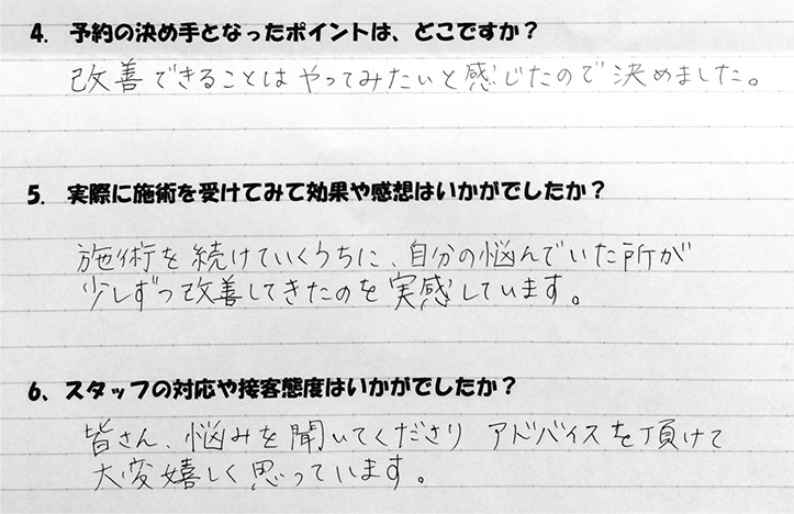 施術を続けていくうちに、自分の悩んでいた所が少しずつ改善してきたのを実感しています。