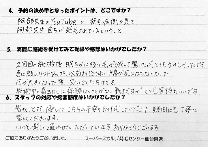 2回目の施術後、明らかに抜け毛が減って驚いたが、とてもうれしかったです。